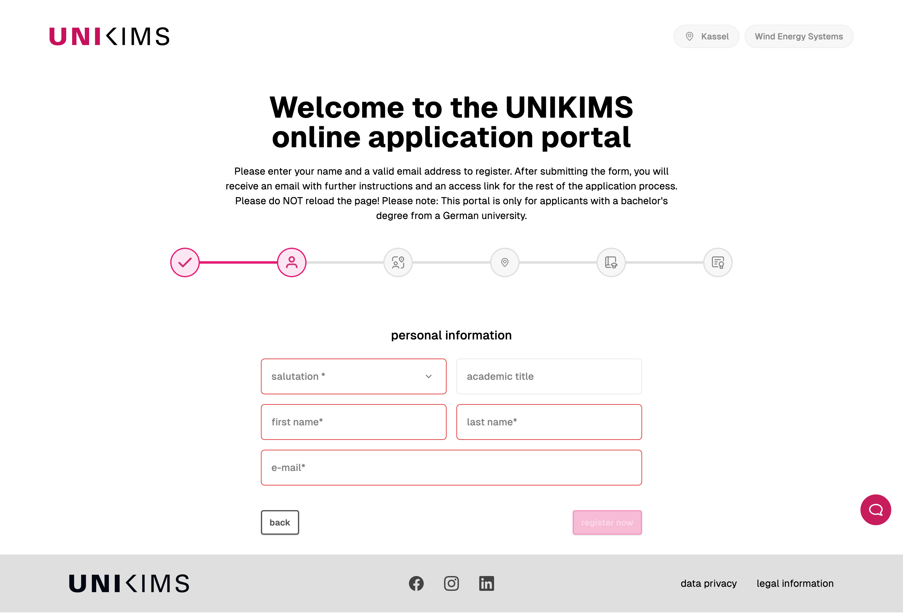 The application portal features a two-step-application-process. First you register with your e-mail, name and surname, then you will receive a link via e-mail to fill out all your information and upload your documents. Please merge all required files into a single PDF-document before the upload.